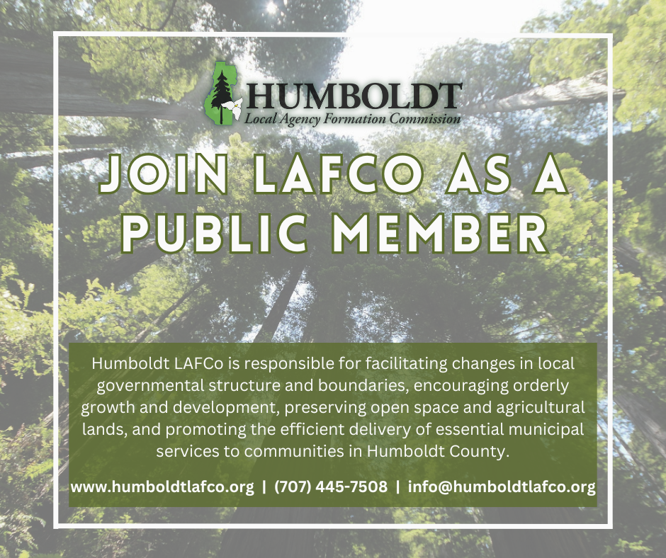 The Humboldt Local Agency Formation Commission (LAFCo) is accepting applications from interested community members to serve as the Alternate Public Member on the Commission. Click the photo below for more information.